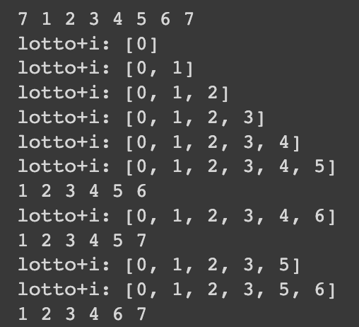 참고로 lotto + [i] 이 과정이 이해가 잘 안되어서, 출력해본 결과는 다음과 같았다. 특히 lotto 리스트에 집합 원소의 index를 적재하는 시스템이라는 점은 유의해야한다!