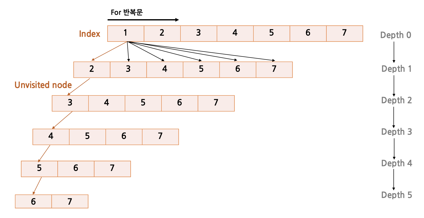 하지만 이 로또 문제와 같은 1차원 그래프 기반의 dfs를 이용하는 문제는 다음과 같이 dfs 함수가 구성된다.