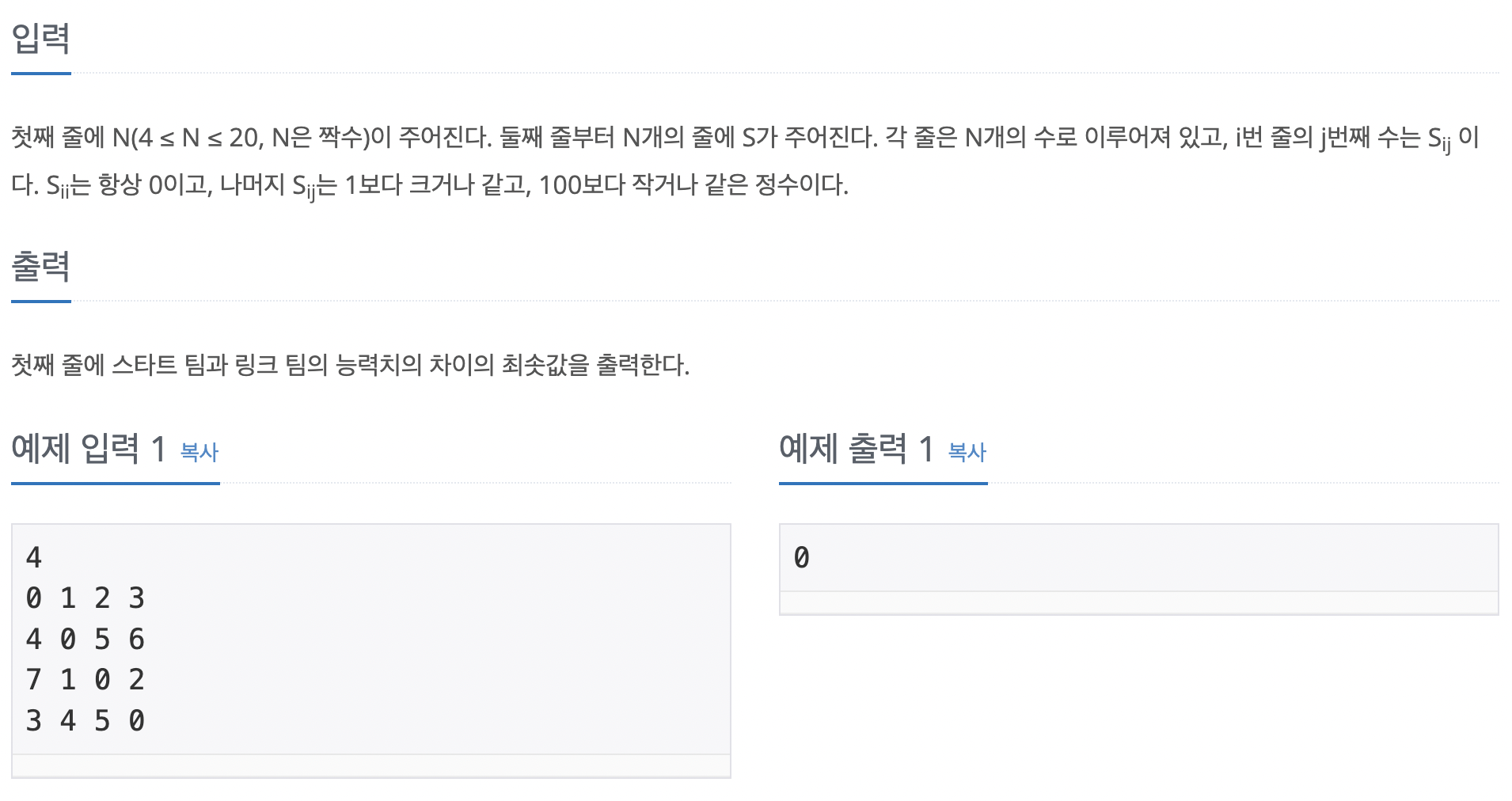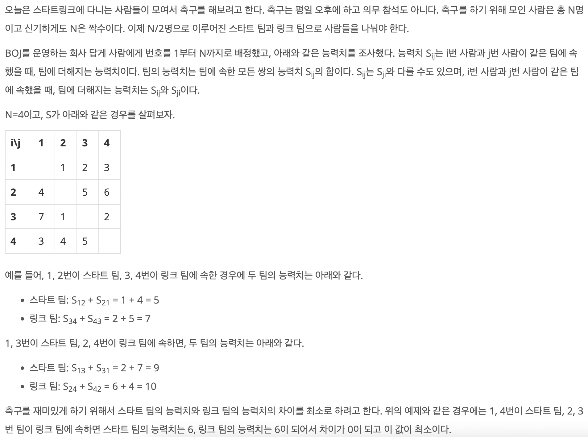 문제가 복잡해 보일 수 있지만, 사실 아래와 같은 diagonal 하게 대칭인 능력치 행렬이 주어지면, 두 팀의 능력치 차이가 최소가 되도록 팀을 나누고, 그 최소값을 반환하는 문제이다.