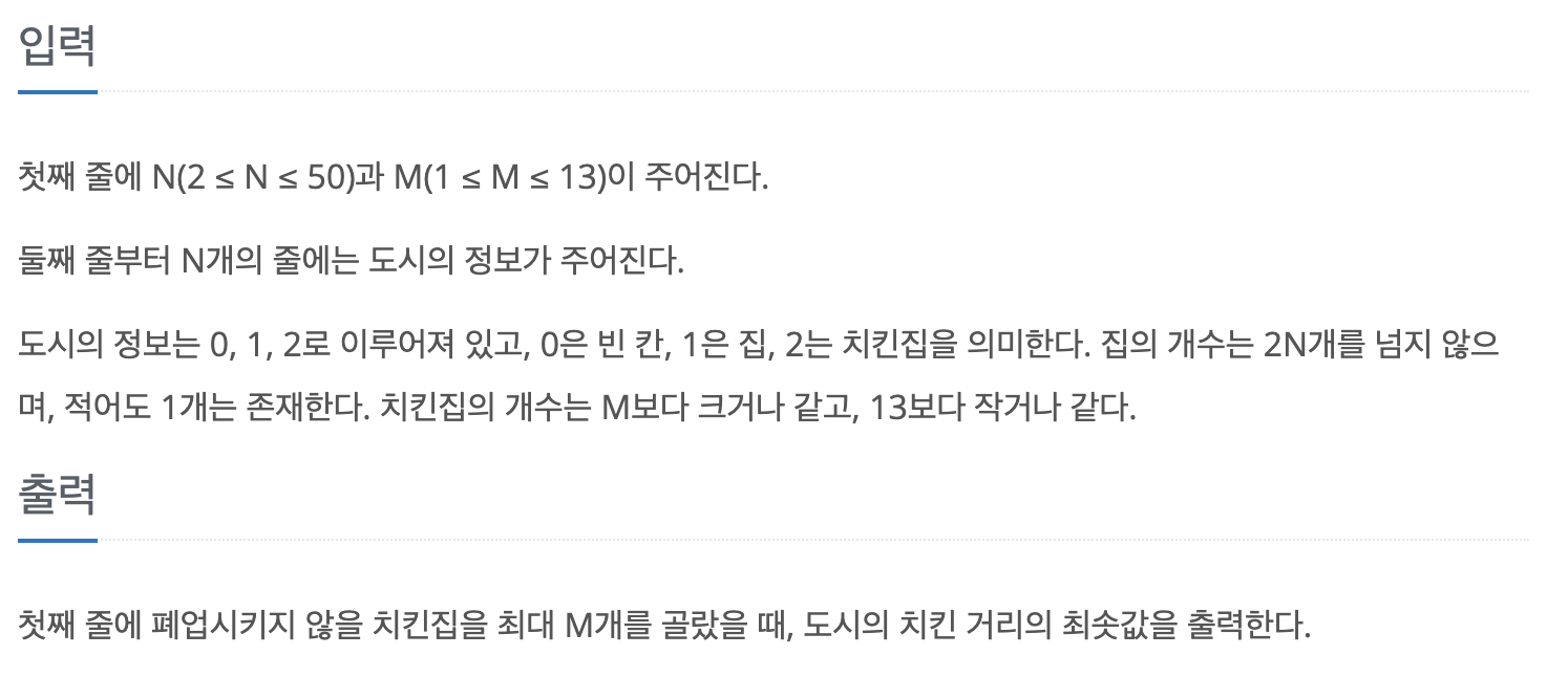 문제가 언뜻 보면 복잡해보이지만, 사실 M개의 치킨집을 선택하는 최적의 입지를 구하는 문제다. 여기서 최적의 입지의 기준이란 각 집으로부터 "치킨거리"의 합이 가장 작아지는 M개의 치킨집을 고르는 경우를 구하는 것 ! "치킨거리"를 구하는 공식 또한 인덱스를 기준으로 하기에 그렇게 어렵지 않다.