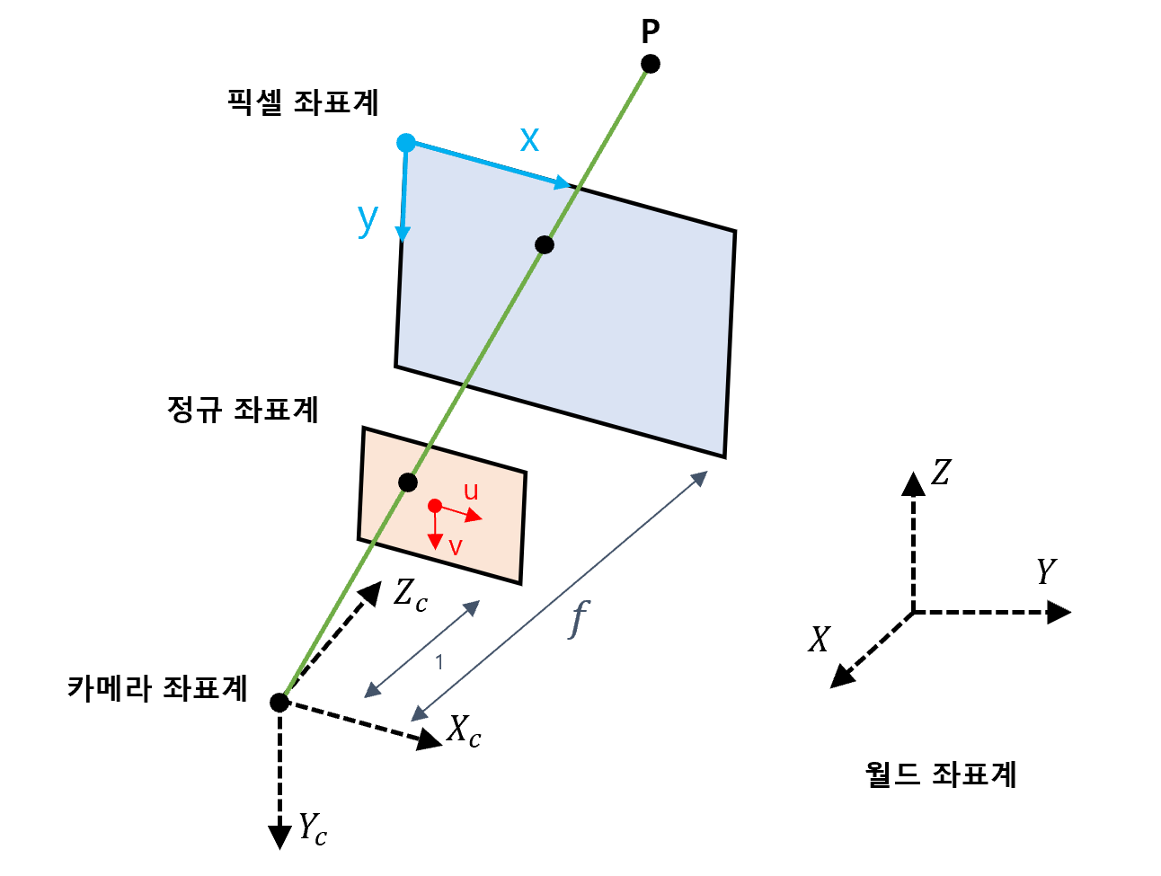 위 그림에서 월드 좌표계와 카메라 좌표계는 3D이고, 픽셀 좌표계와 정규 좌표계는 2D 기반이라고 생각하면 된다. 그럼 네가지 좌표를 차례차례 정리해보겠다.