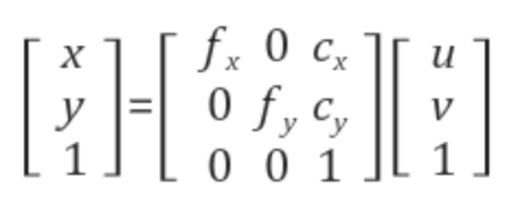 카메라 내부 파라미터(camera intrinsic)를 알면 두 좌표계 사이에 자유롭게 변환이 가능하다. 아래와 같이 말이다. 아래에서 u와 v는 정규 좌표계의 벡터이고, x와 y는 픽셀 좌표계의 벡터라고 생각하자. 가운데 끼어있는 matrix는 카메라 내부 파라미터이다.