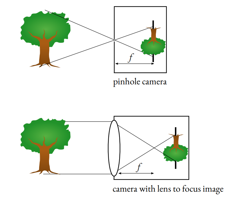 핀홀 카메라 모델은 projection 할 때 사용하는 카메라에 대한 표준 모델이라고 생각하면 된다. 초등학교 때 배운 바늘구멍 카메라와 작동 원리가 유사하다. 아래 그림과 같이 빛을 조그마한 구멍으로 투사시켰을 때 3D 물체가 image plane에서 거꾸로 보이게 된다.