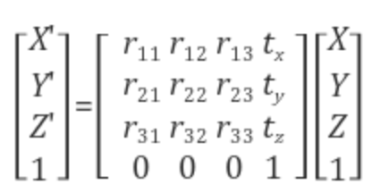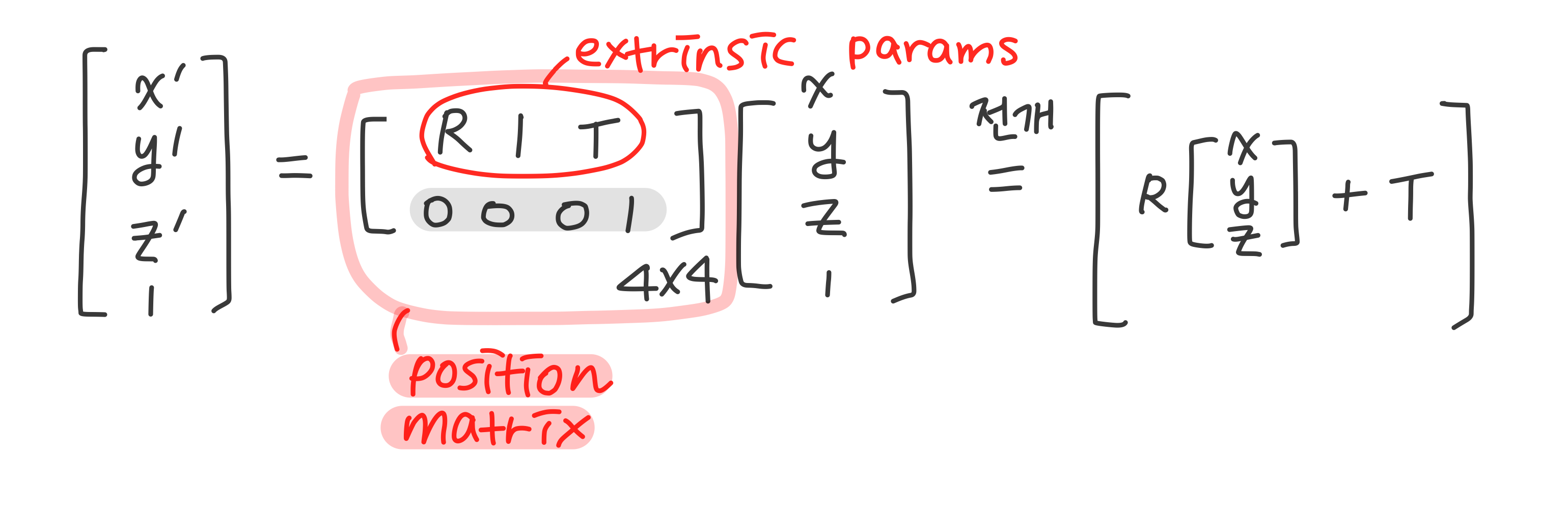 즉, 아래 좌표를 1로 추가함으로써 R과 T를 행렬 곱으로 한번에 나타낼 수 있다는 것이다. (형태만 다른 것이지 위 linear 표현과 전개하면 완전히 같은 식이 나온다) 조금 더 예쁜 식으로 보면 아래와 같다.